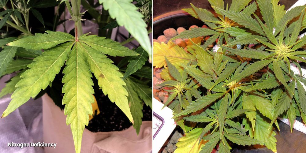 Nitrogen deficiency can result in leaves looking pale, and eventually turning yellow, curling and dropping off. Leaves nearer the base of the plant can be first to display it. Yellowing can progress up the plant. Leaf discolouration/browning can occur. Bloom may seem to be faster, with lower yields and fewer bud points.