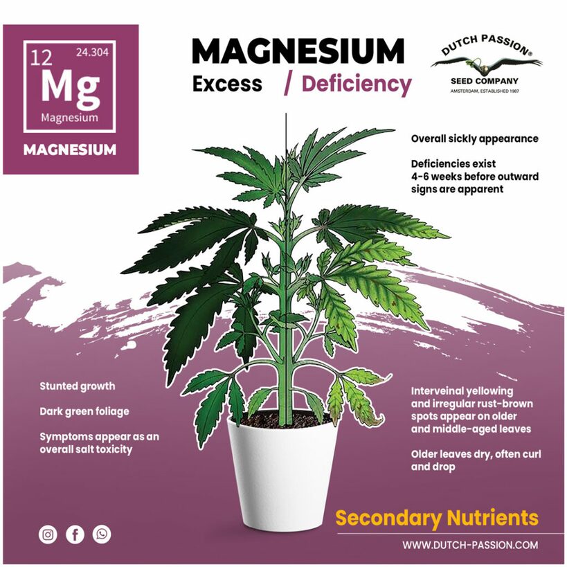 As with all cannabis deficiencies, prevention is better than cure. By the time you see the signs of a Magnesium deficiency your plant may already have been feeling the effects for a month or so. Use good quality compost, large containers will contain more grow nutrients than small containers. You may wish to include some powdered dolomite limestone mixed into your grow medium. This is Magnesium-rich and slowly breaks down releasing Magnesium for the roots to uptake. Specialist Calcium/Magnesium rich nutrients can also be bought in grow shops.