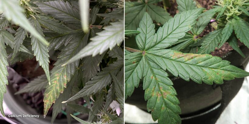 Leaves, especially lower ones can curl and take on unusual shapes. You may also observe yellow/brown spots. These can have brown borders and will grow over time as the problem continues. Root health is also damaged by Calcium deficiency, root tips will slowly die. The result is a stunted plant which will struggle to recover in the worst cases.