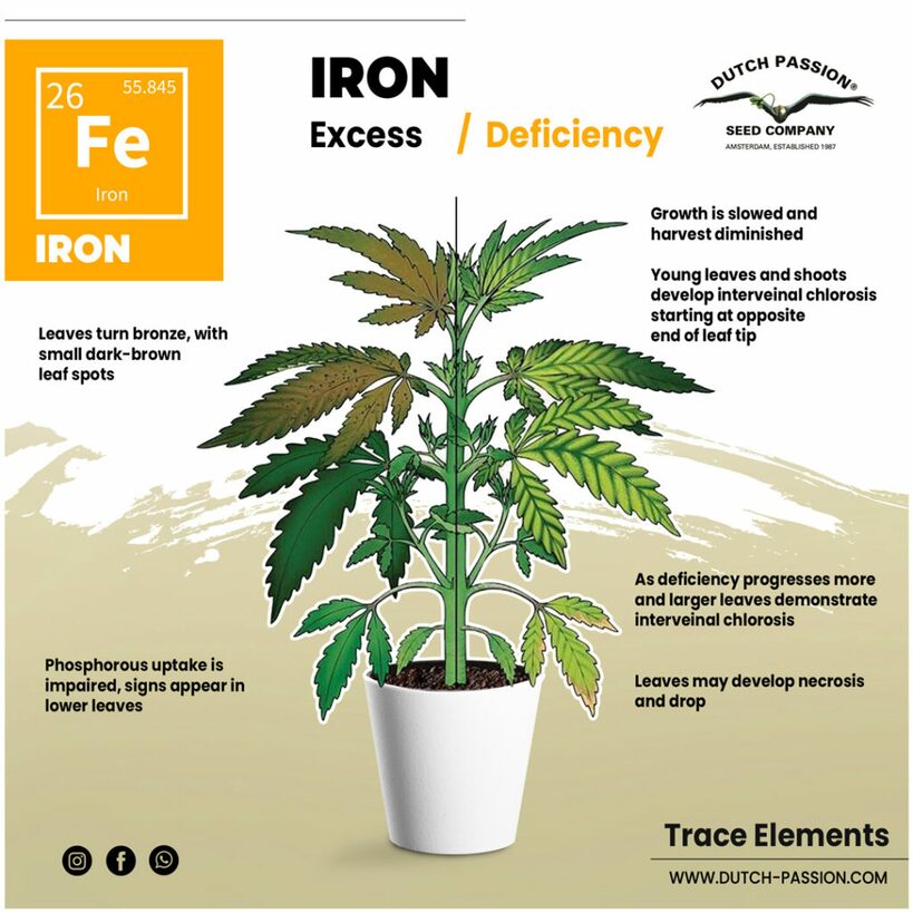 Iron (chemical symbol ‘Fe’) is a semi-mobile macro nutrient. It is necessary in the use of nitrates (Nitrogen containing) and sulphates (Sulphur containing) compounds. Iron is also required for the production of chlorophyll. Iron deficiencies can occur if pH is out of range. It can also be caused by excess Zinc, Manganese or Copper. All of these can interfere with Iron uptake. Iron is an important mineral for processes involved in general metabolic and energy-forming processes.
