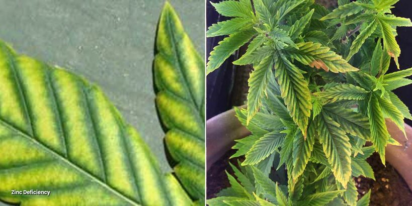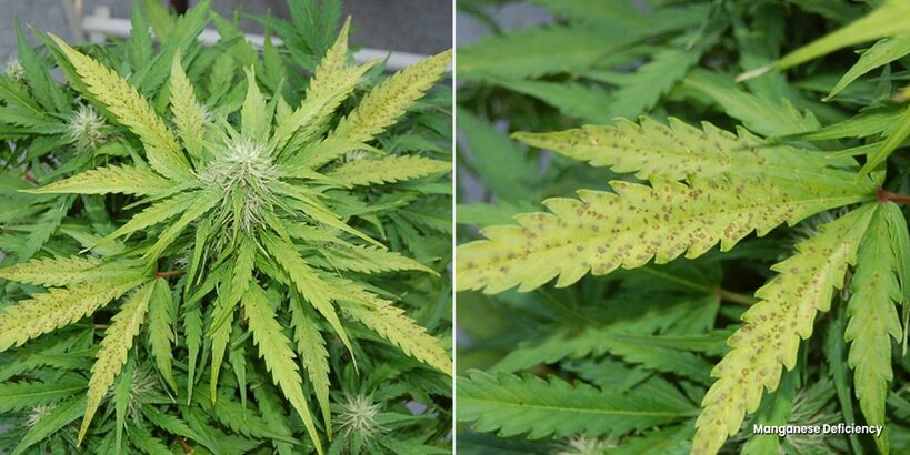 New leaves and new plant growth tend to show interveinal chlorosis. The blades of the cannabis leaf may look wrinkled, yellow and distorted. The leaf tips will discolour (yellow) and may show brown burn at the tips. The leaves may rotate 90º sideways.