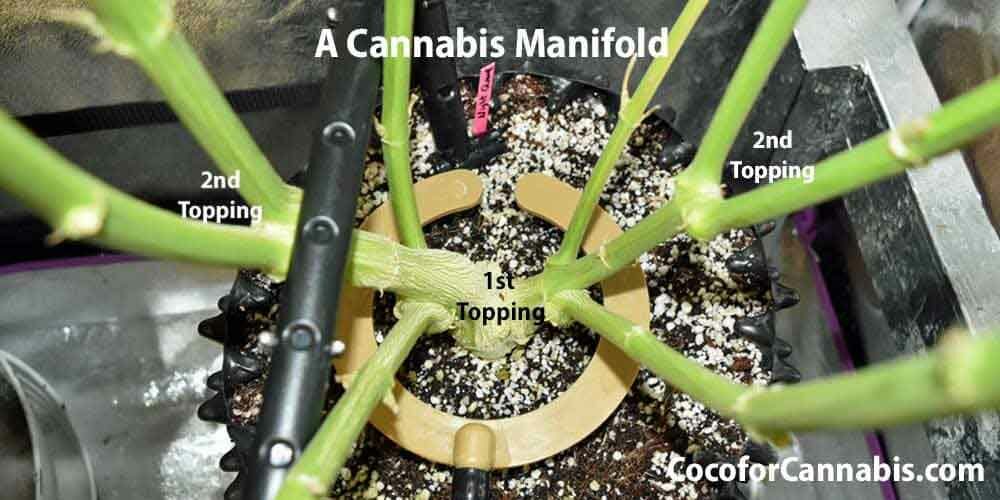 We top manifolds to the third node. This means that we remove the fourth node and everything above it. The branches growing from the third node become the two new “tops”. They are the main branches, and each will be topped again in time. The lower branches from the first and second node were removed during step one. Therefore, following this first topping there are exactly two branches on the plant.