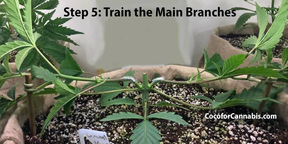 There are two options for this training. You can use low stress training which is gently bending the main branches down and securing them with soft ties. Alternatively, you can supercrop the two main branches.